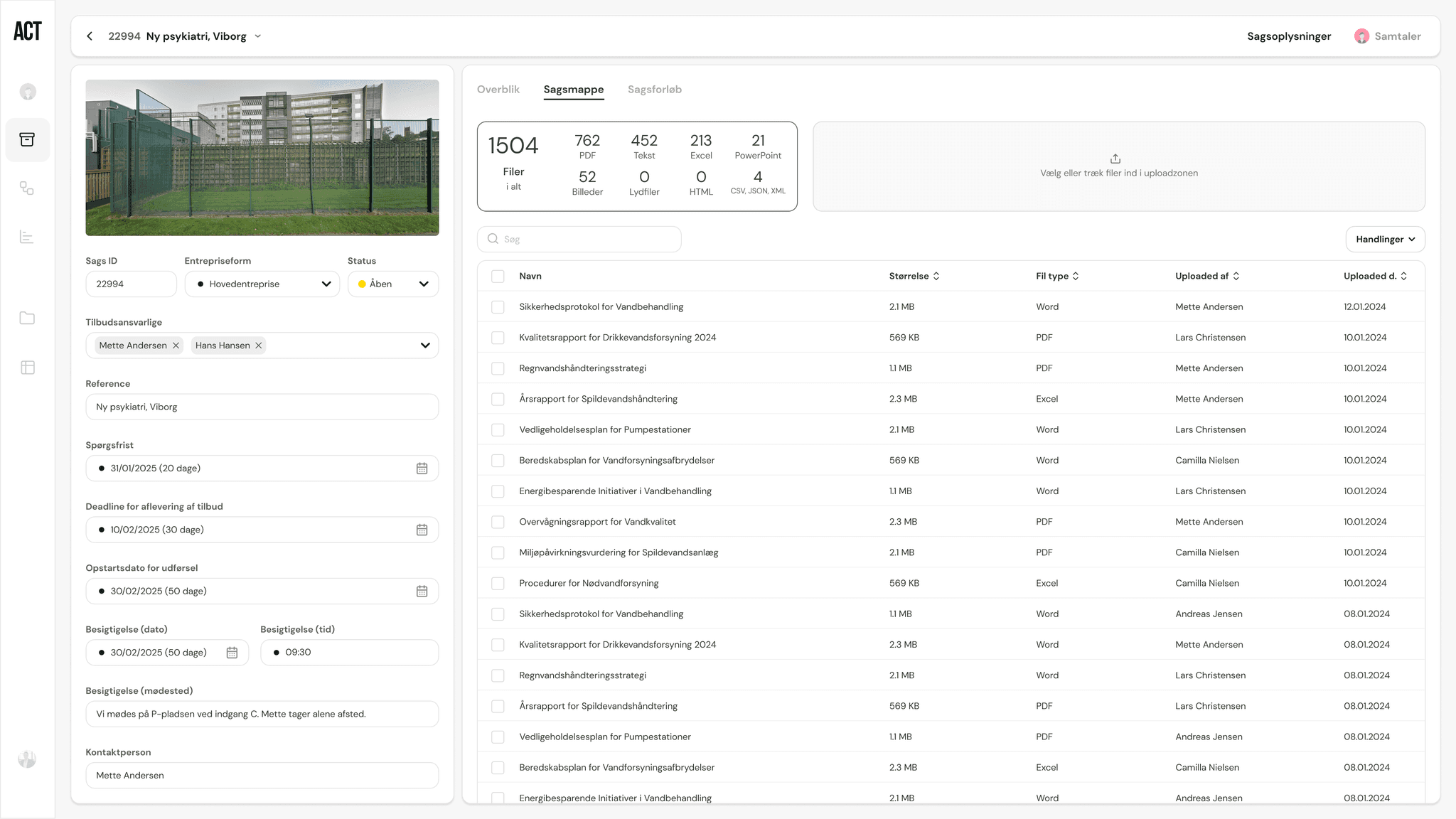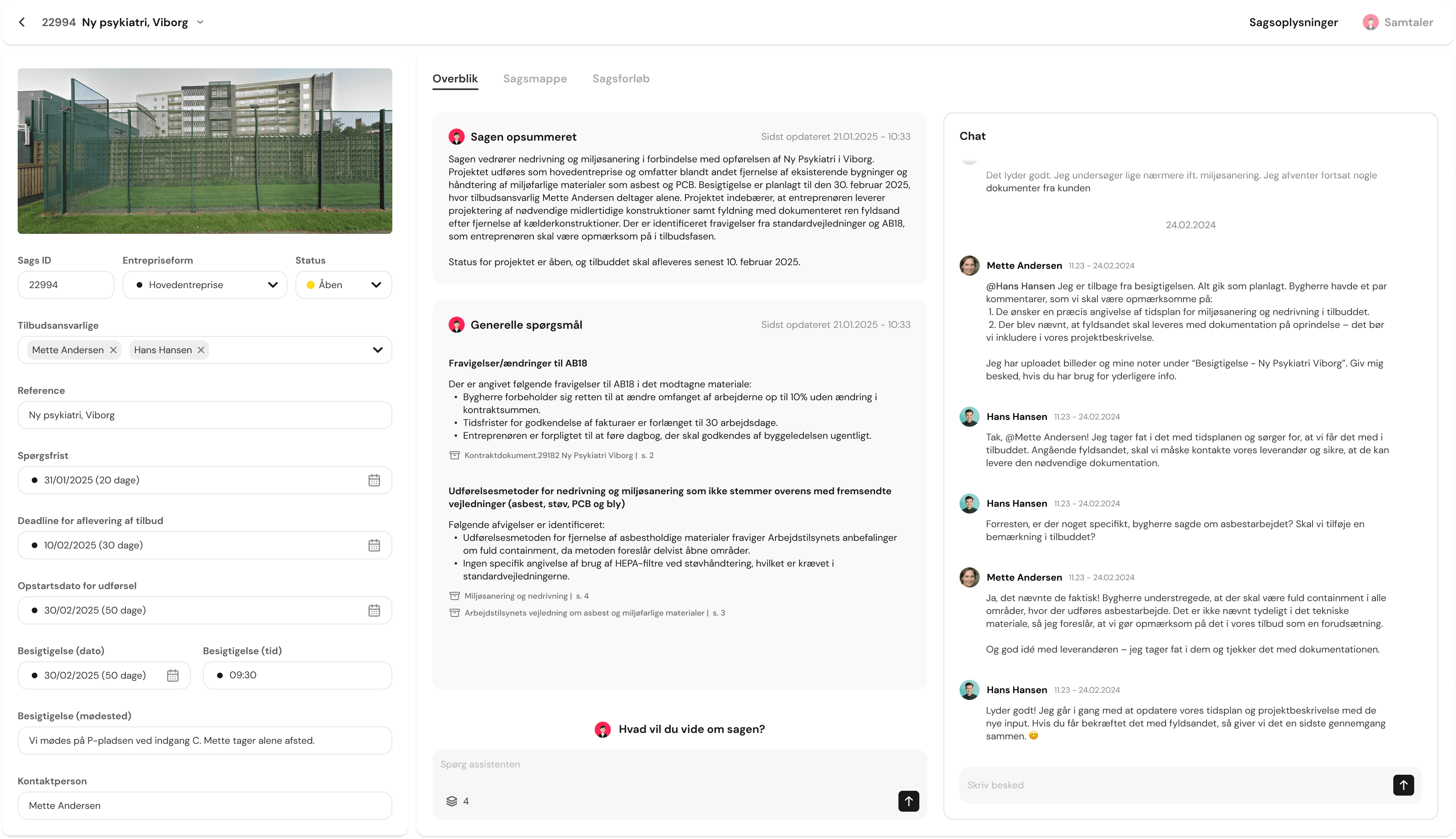 På hver sagsside får medarbejderne adgang til stamoplysninger, deadlines, sagsforløb med udførte handlinger, en organiseret sagsmappe samt en AI-genereret opsummering af sagen som helhed.