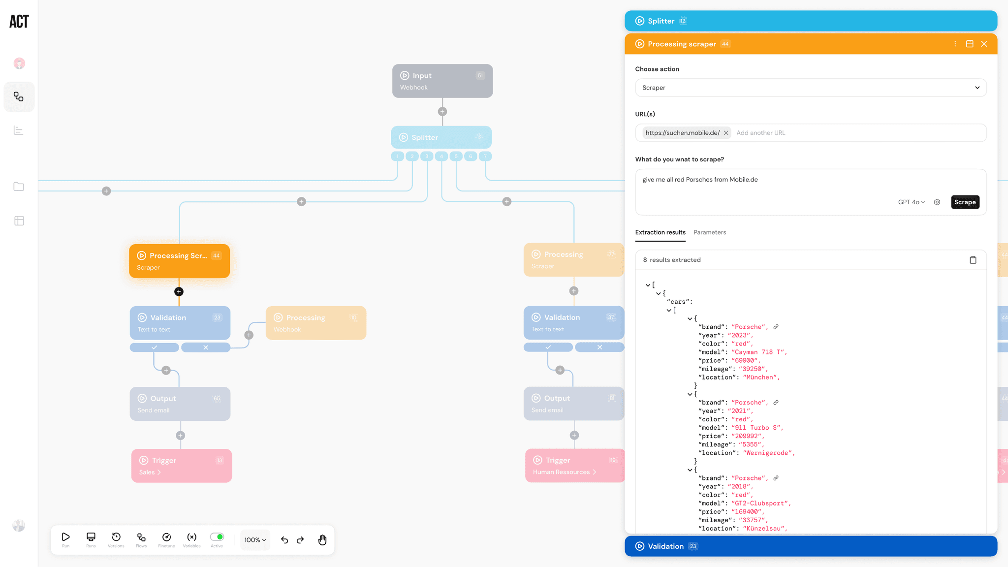 Efter valideringen når dataene til Output, hvor de eksporteres i det ønskede format. Dette kan omfatte generering af en e-mail, oprettelse af en fil (f.eks. PDF eller Excel) eller direkte integration med et andet system. Formålet er at gøre de behandlede resultater tilgængelige for brugere eller efterfølgende arbejdsgange.